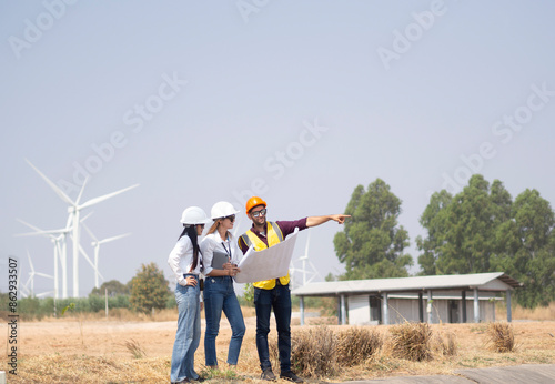 A group of engineers and architects are consulting. About taking care of wind turbines For a sustainable environment