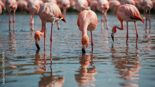 a group of flamingos foraging in shallow waters at dusk