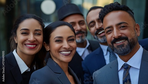 A group of four smiling businesspeople stand closely together outside, wearing business attire and showing positive expressions.