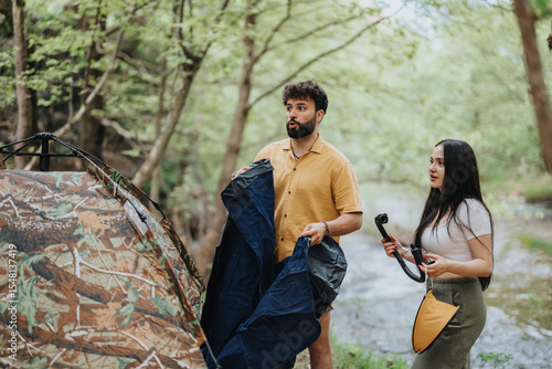 A group of friends assembling a tent in a forest setting near a stream for their outdoor camping adventure, showcasing cooperation and teamwork in a nature-inspired environment.
