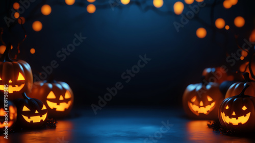 A group of glowing jack-o'-lanterns sit on a dark blue background with string lights, creating a festive Halloween scene.