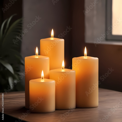 A group of glowing pillar candles with soft, flickering flames, creating a warm ambiance