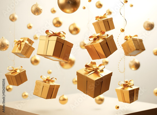 A group of golden gift boxes and ornaments suspended in mid-air, creating an atmosphere of celebration and luxury.