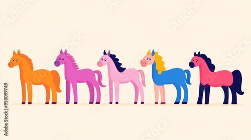 A group of horses are standing in a line, with one of them being pink. The horses are all different colors, including orange, blue, and pink. The scene is bright and cheerful