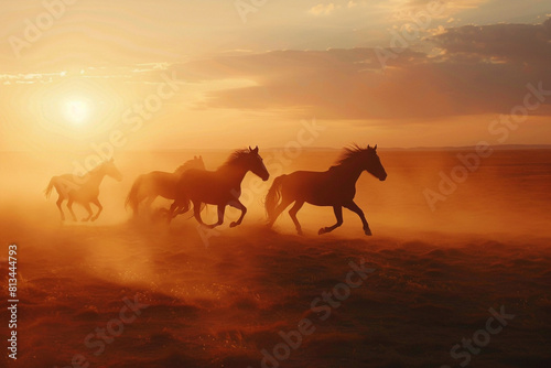 a group of horses running in the desert at sunset