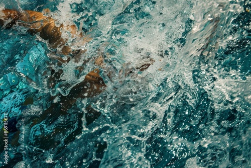 A group of individuals swimming in the water, creating abstract patterns with their strokes, Abstract patterns created by a swimmer's strokes