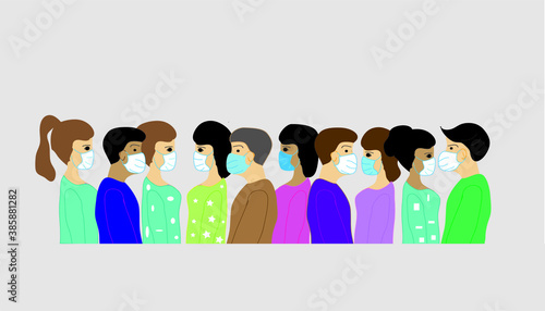 A group of men and women wearing medical masks to prevent coronavirus. Modern design in a flat style.