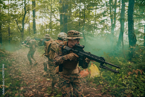 A group of modern warfare soldiers is fighting a war in dangerous remote forest areas. A group of soldiers is fighting on the enemy line with modern weapons. The concept of warfare and military