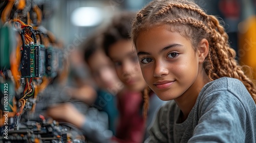 A group of multiracial students learning electronics in a technology lesson, collaborating to build and program electric circuits in a classroom setting.