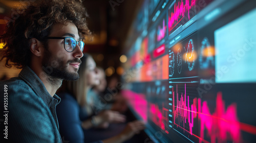 A group of office workers gathered around a large touch screen displaying project timelines and goals, collaborating on the next steps.