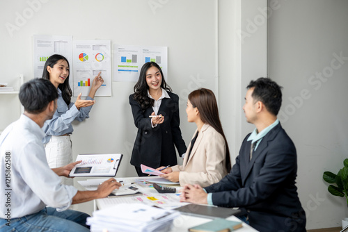 A group of people are gathered around a whiteboard with graphs and charts on it