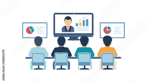 A group of people are watching an online presentation on a computer screen with charts on either side, isolated on white background