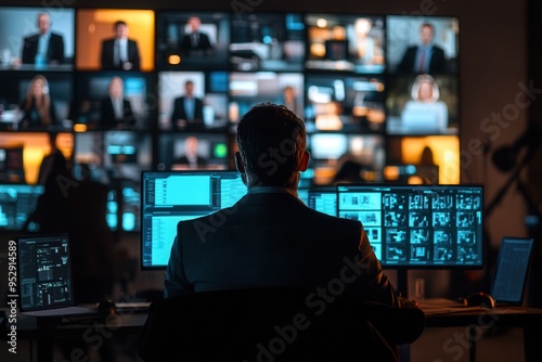 A group of people focused on their tasks in a high-tech workspace, collaborating in front of various computer monitors. Generative AI