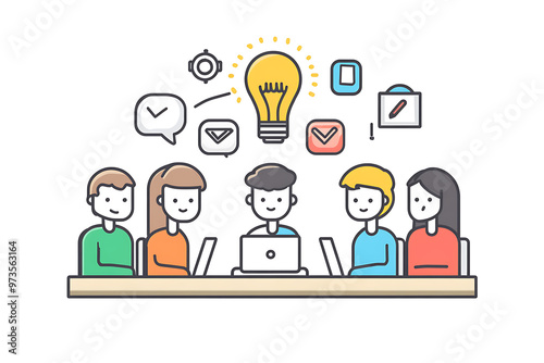 A group of people gathered around a table, engaged in a discussion about innovative ideas, with a laptop at the center. The scene highlights teamwork, collaboration, and creativity and ideas