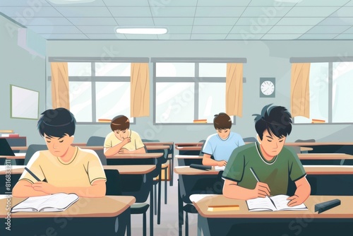 A group of people sitting at desks in a classroom. Suitable for educational concepts