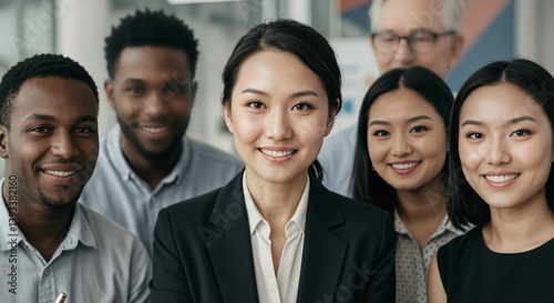 A group of professional coworkers of different ethnicities smiling confidently in a modern office environment, portraying the spirit of teamwork, collaboration, and camaraderie