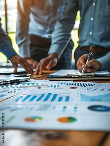 A group of professionals collaborating on financial reports and charts in a meeting setting.