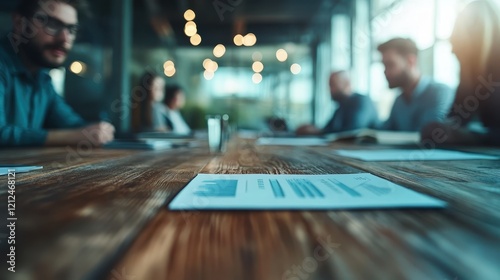 A group of professionals engaged in a dynamic meeting, discussing important strategies and analyzing reports laid out on the wooden table amid a vibrant office atmosphere.