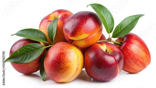 A Group of Ripe Nectarines with Lush Green Leaves on a White Background