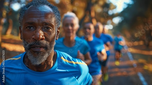 A group of runners led by a man with a gray beard wearing blue shirts running on a path with trees in the background.