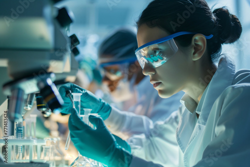A group of scientists in white lab coats are working in a lab. They are wearing masks and gloves and are focused on their work. The lab is filled with various scientific equipment and bottles
