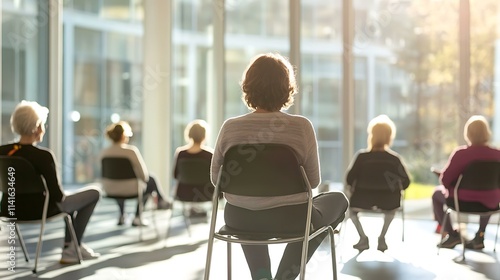 A group of seniors performing chair exercises in a light-filled fitness center with an encouraging instructor