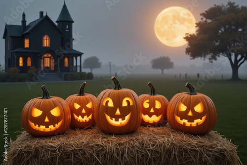 A group of smiling pumpkins with different faces are arranged on a hay bale. The background features a haunted house and a foggy graveyard, adding to the Halloween spirit