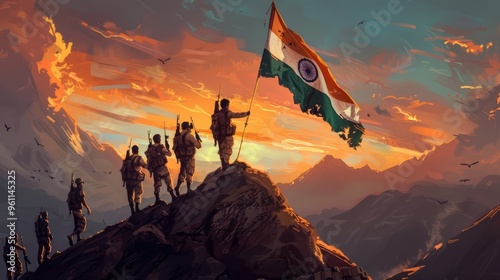 A group of soldiers in uniform stand on top of a mountain holding an Indian flag sunset behind them on the sky.