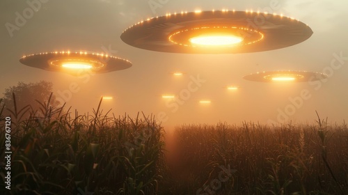 A group of UFOs flying in formation over a cornfield, their lights casting long, dramatic shadows and creating a surreal atmosphere