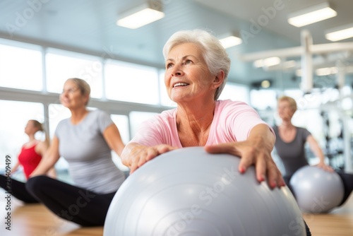 A group of women engaging in a fitness routine, performing exercises on exercise balls, senior women doing pilates with soft ball lying on back in gym, AI Generated