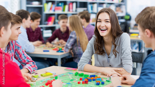 a group of young people playing a game of monopoly in a library or library room with a woman smiling