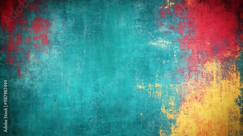 A grungy, colorful background of bright teal, red, and yellow with rough edges for an energetic feel.