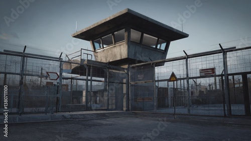 A guard tower stands behind a chain link fence, with barbed wire on top