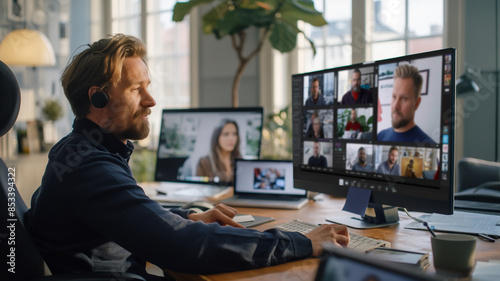 A guy completely absorbed in an online video chat, lounging at his desk with tech gear spread out
