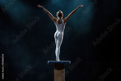 A gymnast wearing white attire maintains a graceful pose on a balance beam, arms outstretched, highlighted under dramatic stage lighting, representing discipline and focus.