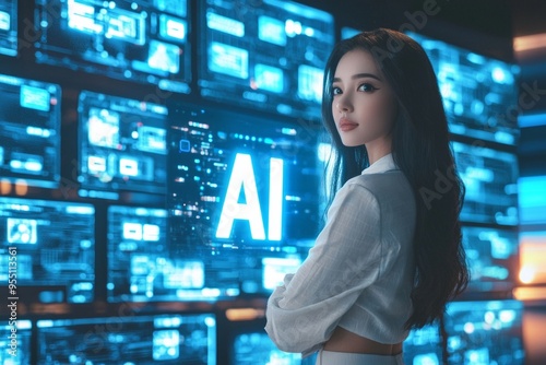 A half body portrait of a beautiful female tv hostess standing in front of a stack of giant digital screens, with text "AI" showing in the background. The concept of virtual presenter