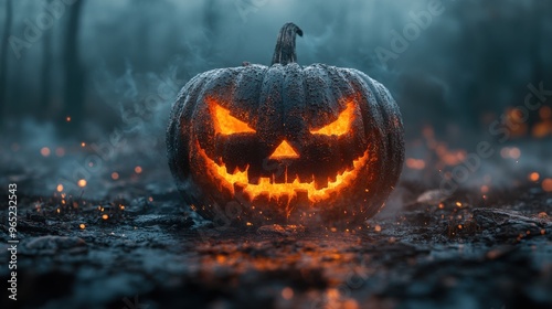 A Halloween jack-o'-lantern with a scary expression, surrounded by mist