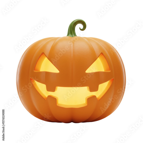 A halloween pumpkin with a carved face and a green stem on a black background illuminated from the inside