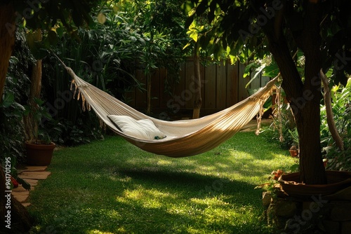A hammock hangs between two trees in a green garden. This photo is perfect for showcasing relaxation and tranquility.