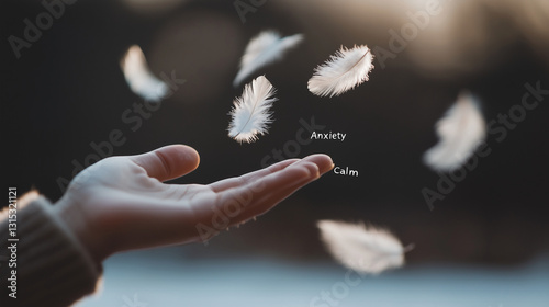 A hand catching falling feathers labeled with emotions
