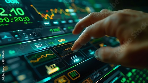 A hand confidently pressing the sell button on a sleek stock market screen, green upward-trending graphs in the background, fingers in focus, vibrant display, realistic lighting, clear button details,