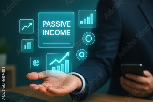 A hand displays a glowing interface showcasing the concept of passive income, with various financial data icons.