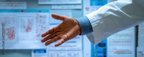 A hand extends from a lab coat against a backdrop of scientific charts and data.