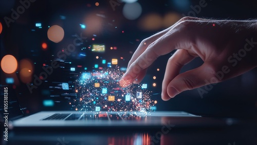 A hand extends towards a laptop, creating a vibrant explosion of digital icons and sparks, set against a dark background, conveying an atmosphere of innovation and exploration.
