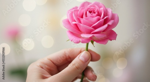 A hand gently holds a single, delicate pink rose against a soft, blurred background