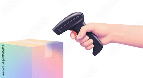A hand holding a barcode scanner over a colorful package, ready for scanning.