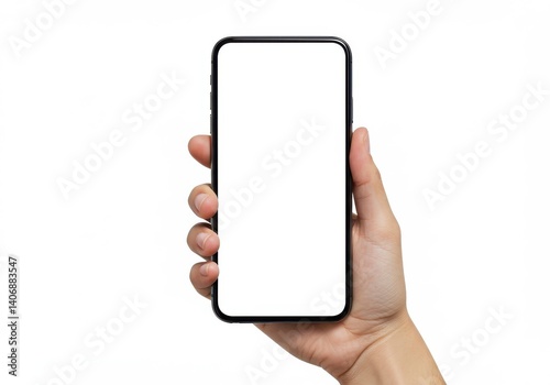 A hand holding a black smartphone with a blank white screen on an isolated white background view