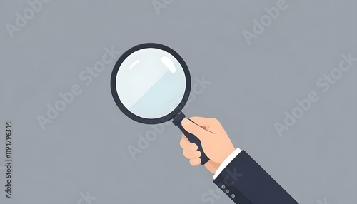 A hand holding a black-handled magnifying glass with a circular lens, set against a transparent background. The image highlights the magnifying glass as the focal point.