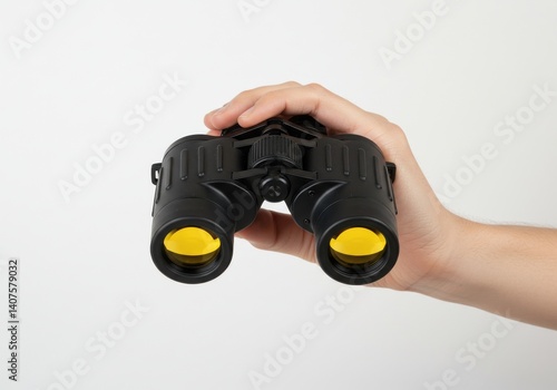 A hand holding a pair of black binoculars with yellow lenses against a white background plain scene