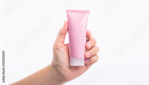 a hand holding a pink cosmetic tube, demonstrating skincare product